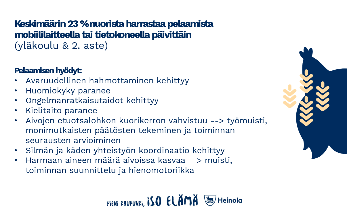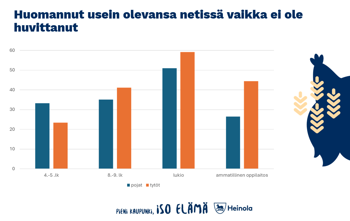 Syyskuun lopussa Heinolan kaupungin Olkkari-illassa selviteltiin mihin lapset ja nuoret törmäävät netissä ja miten aikuisten tulisi toimia epäilyttävän sisällön tullessa ilmi. Tilaisuudessa käytiin läpi kouluterveyskyselyn tuloksia niin valtakunnallisesti kuin Heinolan osalta. Kyselyyn vastaajista Heinolassa ala-asteikäisistä vajaa kolmannes on huomannut olevansa netissä, vaikka ei ole huvittanut. Yläasteikäisistä näin kokee jo 40 prosenttia ja lukiolaisista jopa yli puolet. Ala-asteikäisten kohdalla pojat kokivat tyttöjä enemmän olleensa netissä, vaikka ei ole huvittanut, kun taas vanhemmissa ikäryhmissä tytöt kokevat poikia enemmän kuluttavansa tahtomattaan aikaa verkossa. Muuten vain verkossa hengailu, jopa tahtomattaan, kertoo omaa kieltään esimerkiksi sosiaalisen median koukuttavuudesta.