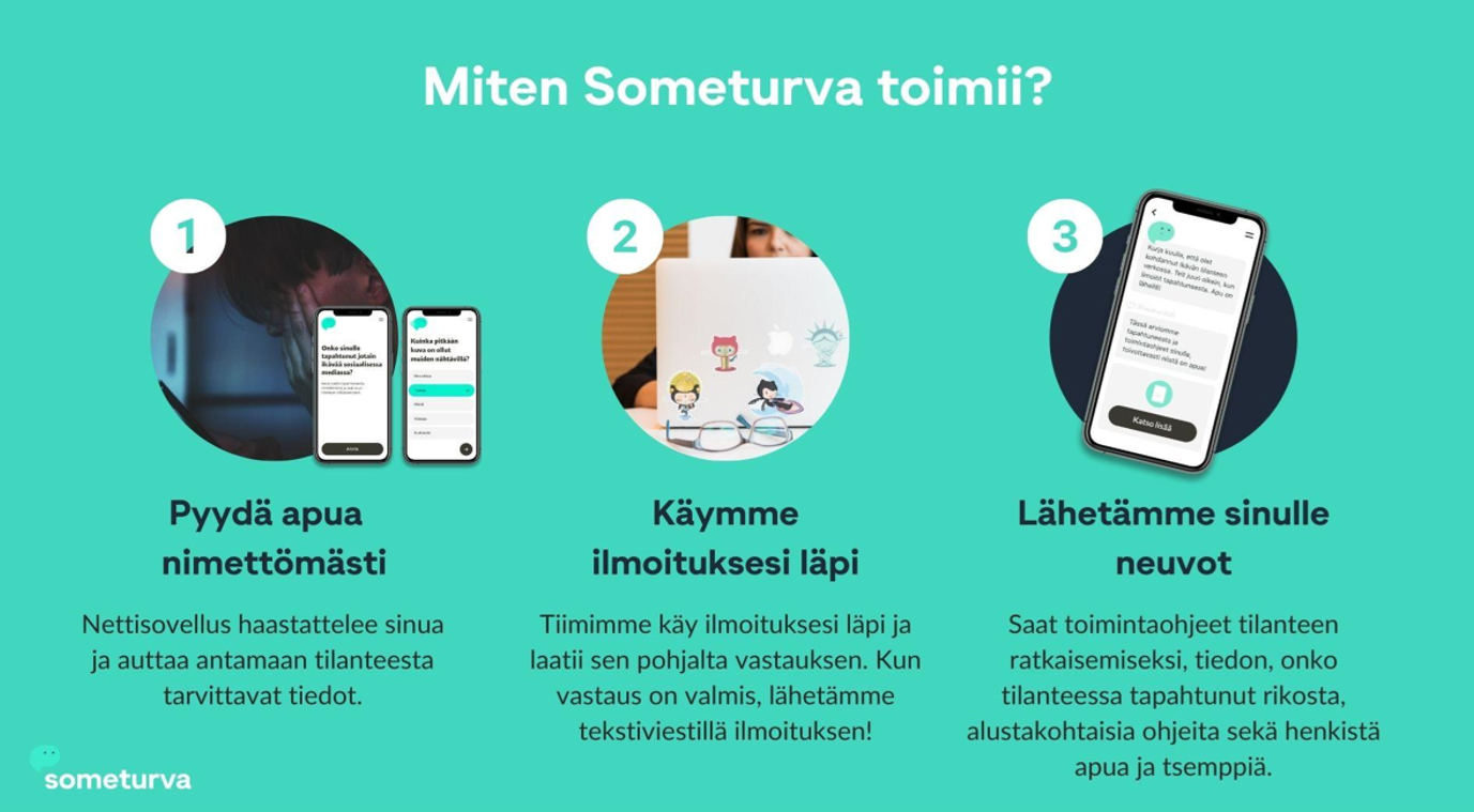 Heinolan yläasteen 7.-9. luokkalaisille sekä Heinolan lukiossa opiskeleville apuna kaikissa netin ikävissä tilanteissa toimii Someturva, joka on nettiselaimessa toimiva sovellus, josta voi kysyä nimettömästi neuvoa jos on joutunut ikävään tilanteeseen somessa, pelissä tai muualla Internetissä. Someturvassa apua saa someen erikoistuneilta ammattilaisilta. Someturvan tiimi koostuu juristeista, sosiaalipsykologeista ja psykologeista.