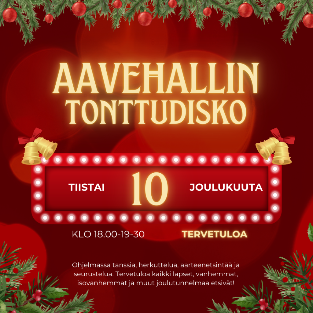 Tiistaitanssien jälkeen Aavehallin valtaa 10.12. klo 18-19.30 Tonttudisko! Ohjelmassa tanssia, herkuttelua, aarteenetsintää ja seurustelua. Tervetuloa kaikki lapset, vanhemmat, isovanhemmat ja muut joulutunnelmaa etsivät!