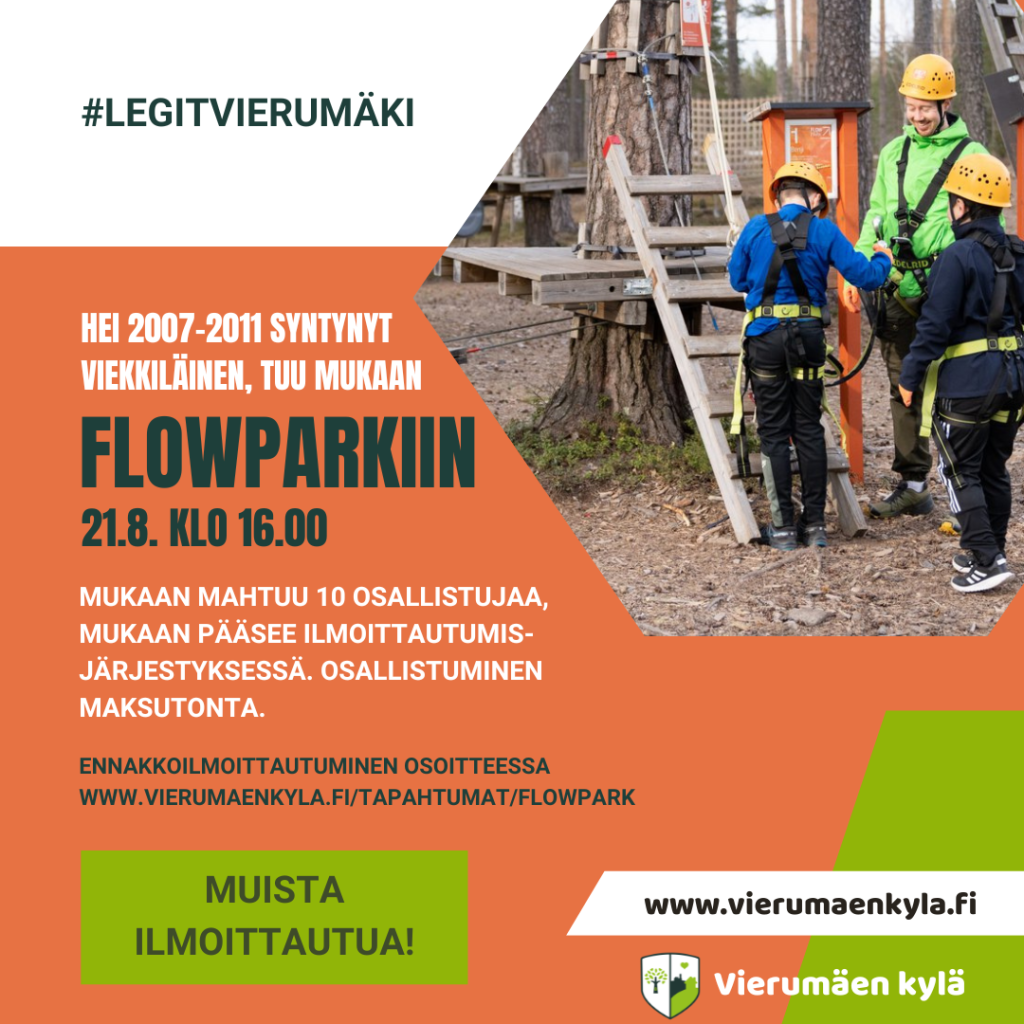 Hei 2007-2011 syntynyt viekkiläinen, tuu mukaan Vierumäen Flowparkiin 21.8. klo 16.00!
