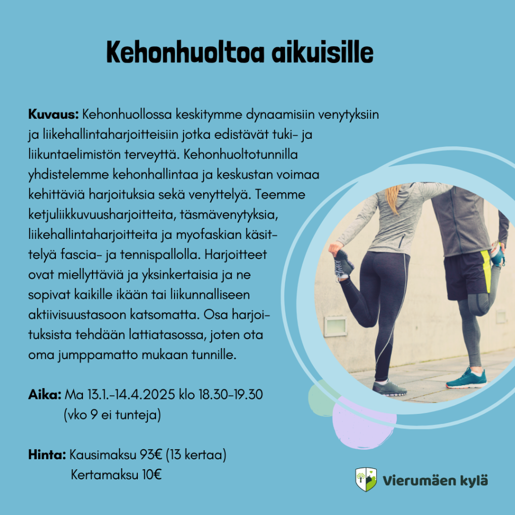 Aikuisten kehonhuolto saa jatkoa Vierumäen koululla myös keväällä 2025! Paikka, aika ja ohjaaja ovat samoja ja kurssi alkaa 13.1. kestäen 14.4. saakka (talvilomaviikolla 9 ei tunteja). Kausimaksu keväälle on 93€/13 kertaa, kertamaksu 10€ kerta.