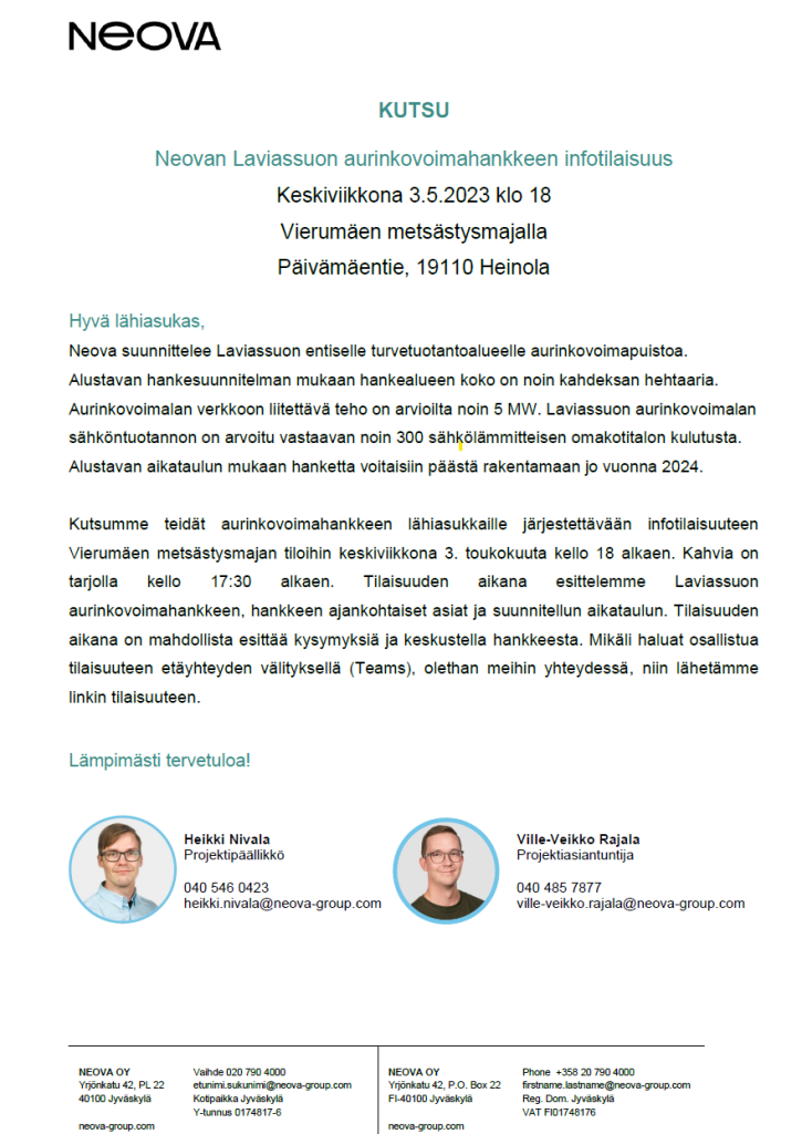 NEOVAN LAVIASSUON AURINKOVOIMAHANKKEEN INFOTILAISUUS Vierumäen metsästysmajalla (Päivämäentie 10C) klo 18. Kahvia tarjolla klo 17.30 alkaen. Kutsu alla: