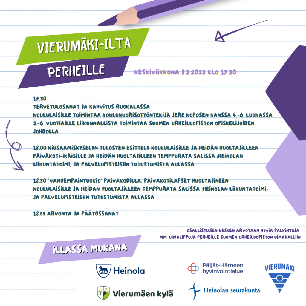 Tervetuloa viettämään toiminnallista iltaa perheille Vierumäen koululla ja päiväkodilla keskiviikkona 8.3.2023 klo 17.30 alkaen.